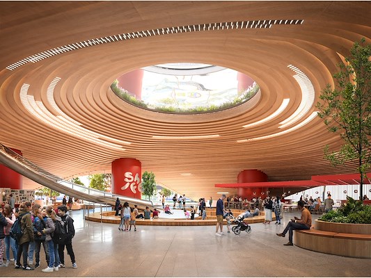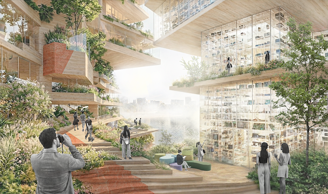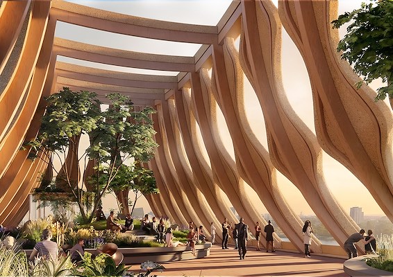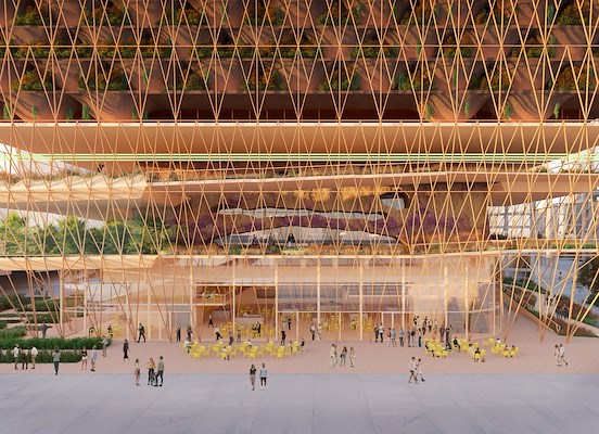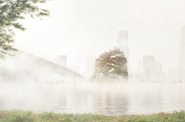 : Een gebouw voor Rotterdam, gevormd door lagen van activiteit die een rif-achtig ecosysteem weerspiegelen, mensen samenbrengen, klimaatbewustzijn stimuleren en lichtere manieren van leven inspireren.