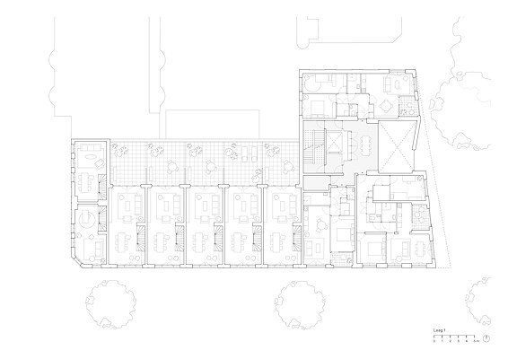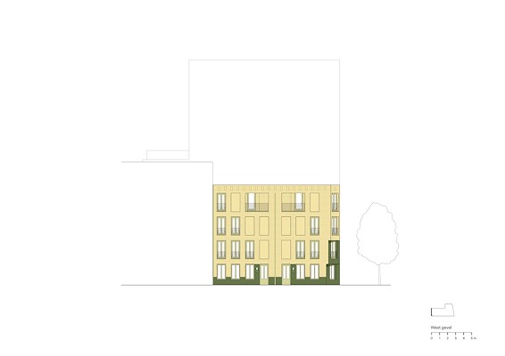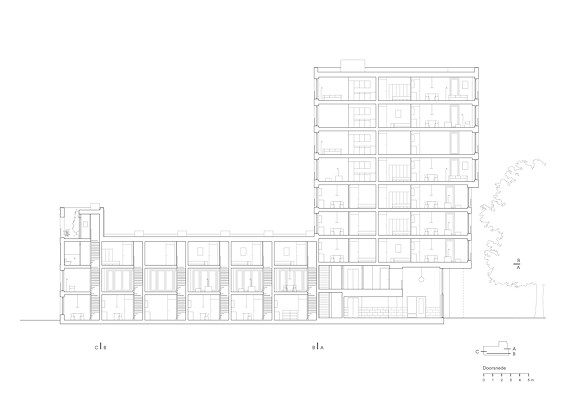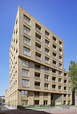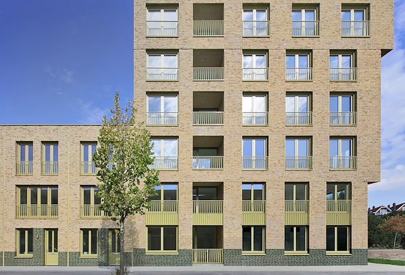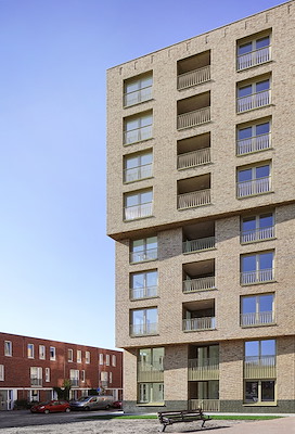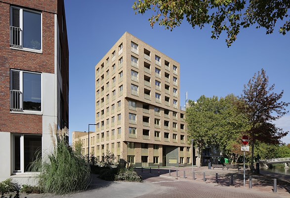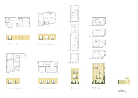 Het woonprogramma behelst appartementen in de negen verdiepingen tellende toren, vierlaagse hoekwoningen en grondgebonden woningen van drie lagen aan de straat. De torenappartementen hebben een compacte opzet, maar zijn wel voorzien van eigen buitenruimtes in de vorm van loggia’s. De eengezinswoningen beschikken over een voordeur aan de straat en een dakterras. De hoekwoningen markeren de hoek van de straat met een klassiek getrapte afschuining. Tussen de toren en hoekwoningen zijn de gezinswoningen aan de straat individueel afleesbaar.