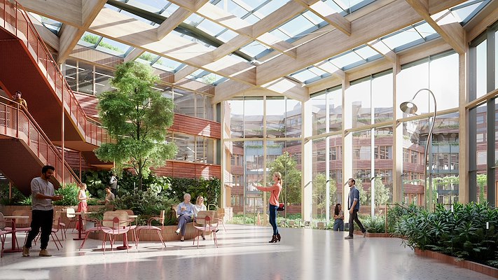 ontworpen. “Hierbij staat de menselijke maat centraal. Goede akoestiek, tactiele materialen, plekken voor concentratie en voor ontmoeting. We ontwerpen geen anonieme, grote kantoorvloeren, maar een omgeving waarin je je kan oriënteren. Waar hout, groen en tactiliteit bijdragen aan een gevoel van rust en geborgenheid, midden in de dynamiek van de stad”, aldus de architecten.