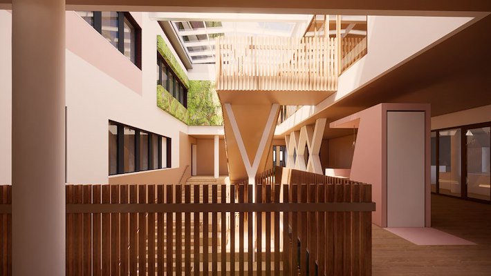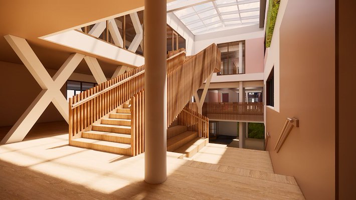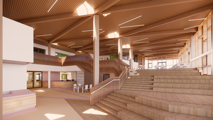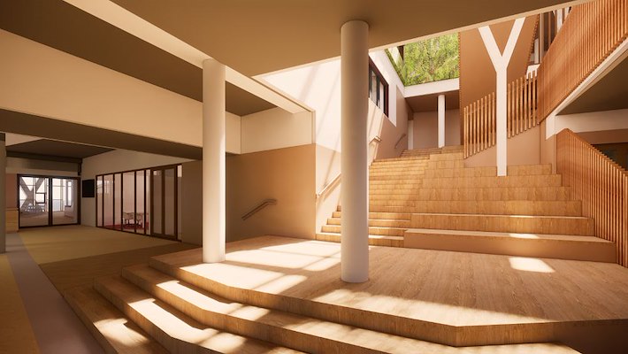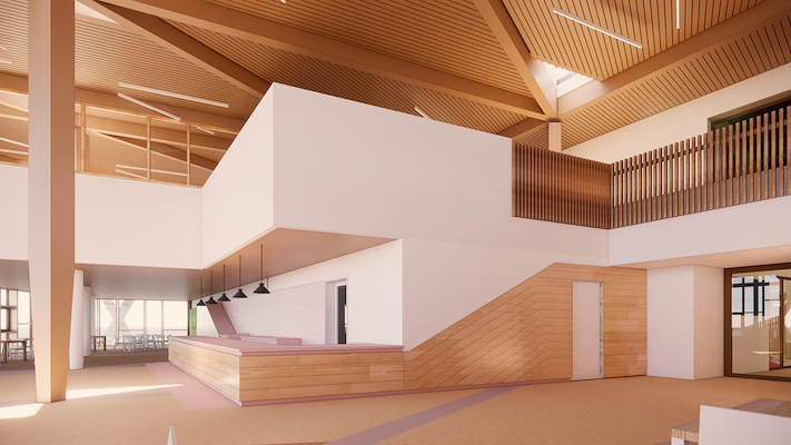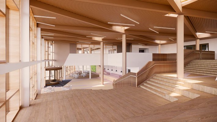 , moet een plek worden waar studenten, docenten en andere betrokkenen samenkomen om te leren, onderzoeken en samenwerken. Spil in het ontwerp vormt de doorlopende verbindende ruimte vanaf de entree tot aan de bovenste verdieping.