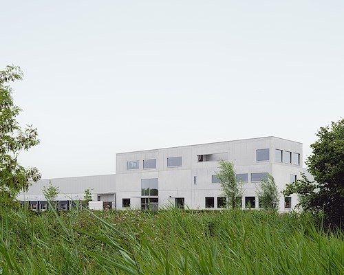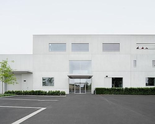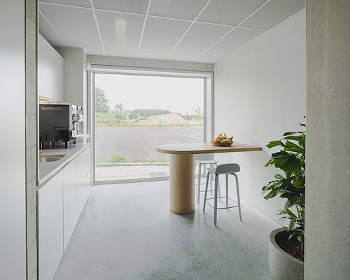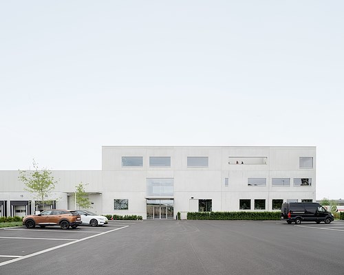 Het kantoorvolume is opgebouwd uit prefab betonnen panelen die in elementverdeling aansluiten op de gevels van de loods. De verhoudingen en compositie van de raamopeningen komt direct voort vanuit de wensen en randvoorwaarden van achterliggend ruimtegebruik. Door de variatie daarin te laten bestaan en de diversiteit juist in te zetten als kwaliteit krijgt de gevel een wat ongedwongen karakter. De weggedetailleerde, blanke aluminium kozijnen vergroten tegelijk het abstractieniveau. De uitstekende bovenste kantoorlaag heeft een meer verfijnde afwerking, zodat deze zich op subtiele wijze onderscheidt van de rest van het gebouw.