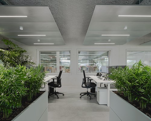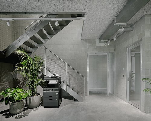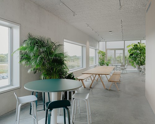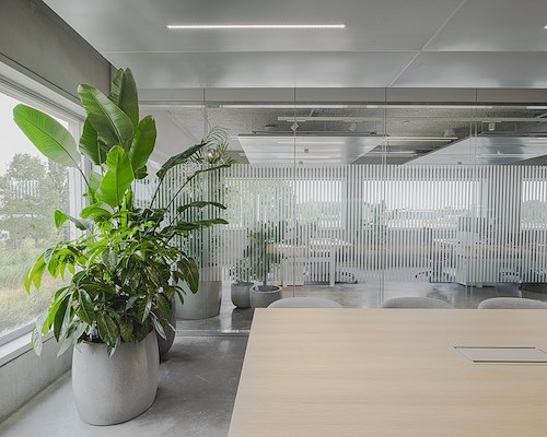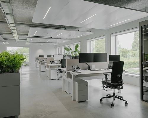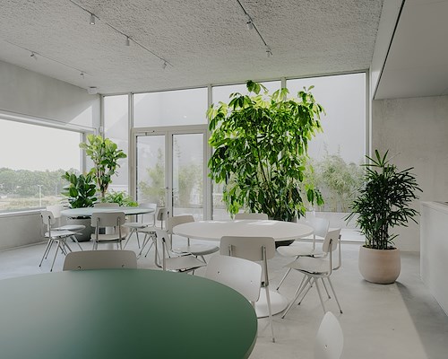 ontworpen. Door de materialisatie van de gevels terug te laten komen wilden de ontwerpers exterieur en interieur tot een geheel versmelten. Betonnen vloer- en wandafwerkingen, stalen plafonds in combinatie met akoestisch spuitwerk en blanke aluminium kozijnen geven in combinatie met opbouwinstallaties een industrieel, maar tevens sereen en ingetogen beeld.