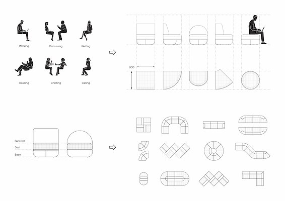 Het banksysteem is onder meer gevoed door inzichten uit gebruikersonderzoek in uiteenlopende projecten. Op basis van data over gedrag en gebruik is een modulair systeem ontworpen dat niet uitgaat van statische meubeltypologieën, maar van hoe mensen zich daadwerkelijk gedragen in een ruimte. Elke module is ontworpen op basis van activiteitgerelateerde eisen, als antwoord op de verschillende manieren waarop mensen ontspannen, samenkomen en werken.
