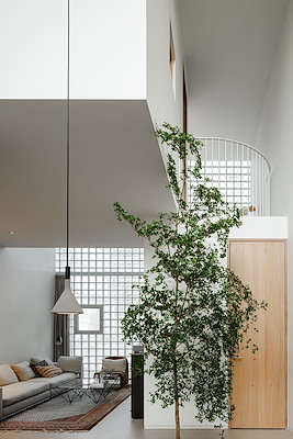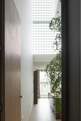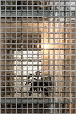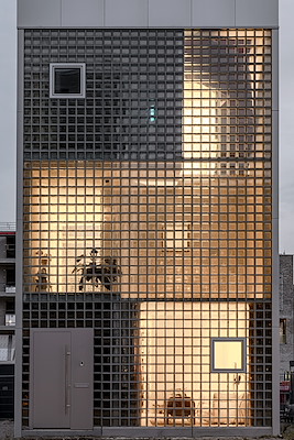 De onderste helft van het huis ligt achter een muur van vierkante glasblokken. De blokken laten daglicht diep het huis binnenvallen en vervormen tegelijkertijd het zicht, zodat het leven binnen vanaf de straat waarneembaar is, maar op zo’n abstracte manier dat de bewoners hun gevoel van geborgenheid behouden