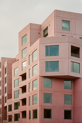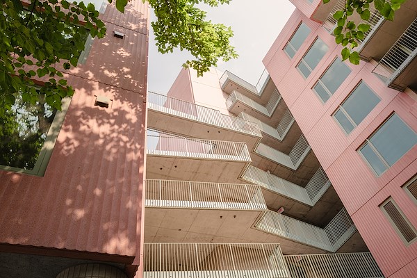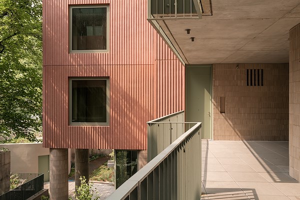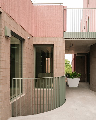 Dat streven uit zich niet alleen door de keuze voor een oudroze gevelkleur, maar meer nog door de inspanningen om met de architectuur, interieur en buitenruimte tegemoet te willen komen aan de behoefte aan menselijk contact, lucht en lucht.