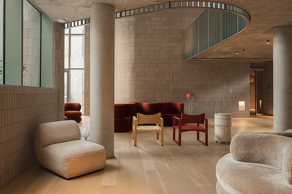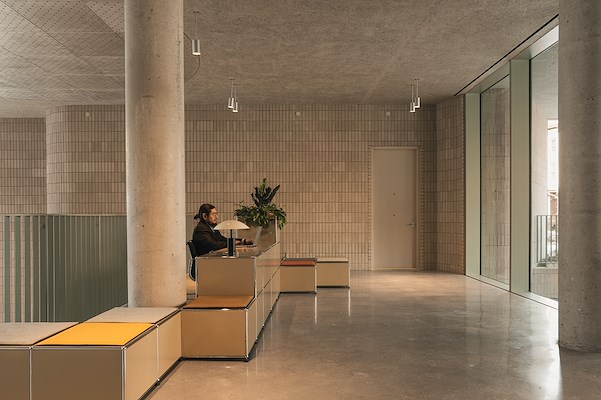 De binnenruimtes van het gebouw zijn ontworpen in samenwerking met designmerken en lokaal talent. Het middelpunt van de lobby is een speciaal ontwerp op maat met bureau, lobbyzitjes, beveiligde opbergruimte, plantenbakken en een boekenplank van het Zwitserse systeemmerk USM. De lobby bevindt zich net boven een co-working lounge met dubbele hoogte die gekenmerkt wordt door de toepassing van warme baksteen, gepolijst beton en gedempte verlichting. Hier staan verschillende meubels van het merk VERSO. De lounge kijkt uit de tuin die is ontworpen door Marie Salembier en Julia Watson.