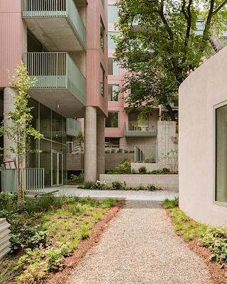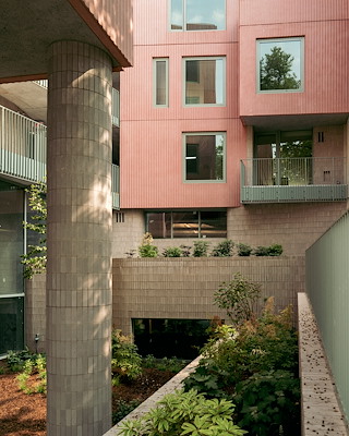 De architecten hebben daarbij de beoogde verbinding van het gebouw met de buurt, die aan de straatzijde goed zichtbaar is, voortgezet in zowel het interieur als de buitenruimte die bestaat uit een binnentuin, balkons en dakterrassen. De relatief grote ramen bieden zicht op de omliggende buurt vanuit meerdere gezichtspunten in zowel de appartementen als vanuit de gangen.