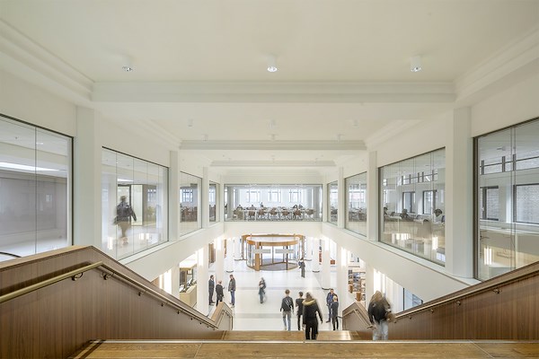 Het materialisatieconcept van het interieur is afgestemd op de duurzame ambitie van de samenwerkende onderwijsinstellingen. Er is gekozen om niet de afzonderlijke gebruikers, maar juist de karakteristieken van het gebouw als overkoepelend en verbindend element in te zetten. Naast het weer zichtbaar maken van opvallende constructieve elementen komen de rijke afwerkingen van het oorspronkelijke gebouw terug in moderne vorm.