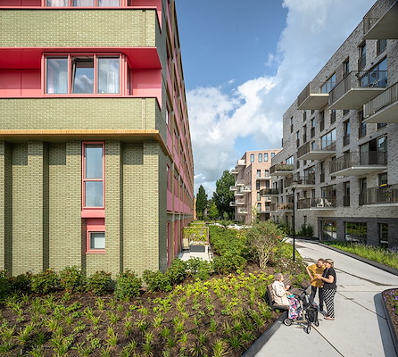 In Hilversum is afgelopen jaar woningbouwproject Nieuw Zuid voltooid. Op de plek van het voormalige zorgcomplex Zuiderheide zijn vijf appartementengebouwen voor verschillende doelgroepen gerealiseerd, naar ontwerp van verschillende architectenbureaus.