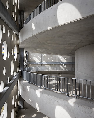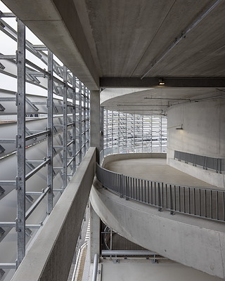 Het hart van het gebouw, dat is gerealiseerd van materialen als beton en aluminium, wordt gevormd door een vide die vanaf niveau +3 doorloopt tot het dak. In de toekomst komt er op het derde niveau een verhoogd voetgangersplein dat het parkeergebouw direct verbindt met de terminal. Om het energieverbruik te beperken, is het dak volledig voorzien van zonnepanelen en is er ‘slimme’ verlichting toegepast.