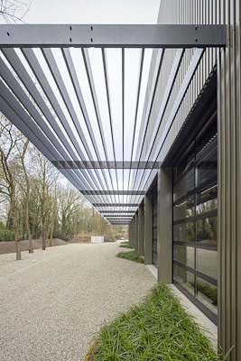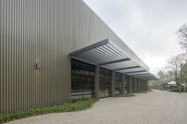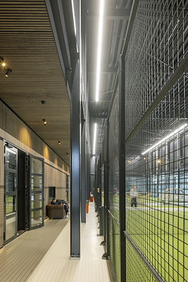 Aan de zijde van het groen opent het gebouw zich met een reeks overheaddeuren onder een slanke stalen luifel met aluminium lamellen. Wanneer de deuren geopend zijn, ontstaat een directe verbinding tussen binnen en buiten en wordt de sport zichtbaar vanaf het terrein. De luifel markeert de overgang tussen gebouw en landschap en biedt beschutting aan spelers en bezoekers.