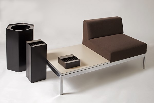 Kho Liang Ie, prullenbak en asbakken met het modulaire zit- en tafelsysteem 720 voor Schiphol, 1965–1966, prod. Interdesign, Egmond, en Artifort, Maastricht.