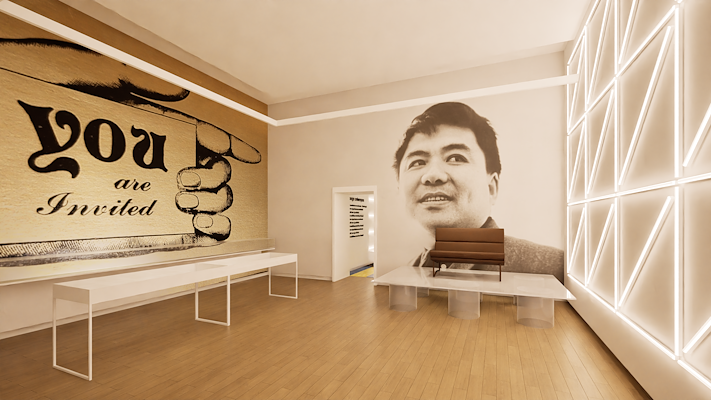 Visualisatie tentoonstellingsontwerp Strijkers Studio, introductiezaal Kho Liang Ie - Mid-Century Modernist