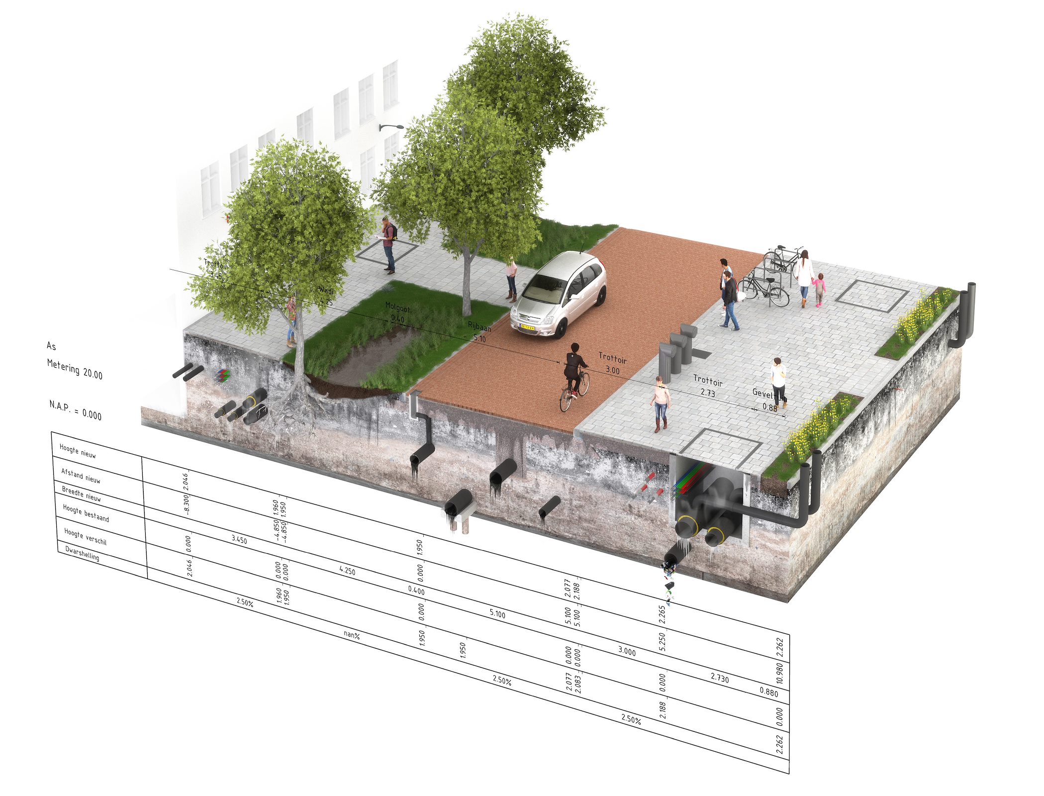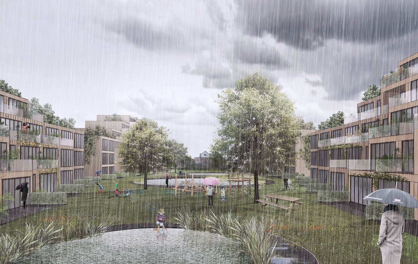 In opdracht van de BNA en de TU Delft onderzochten wij in 2021 hoe regenwaterretentie op kavelniveau kan bijdragen aan het ontlasten van de waterinfrastructuur van de stad. Bij de uitwerking van een extreem scenario ontwierpen wij een wijk met een volledig autarkische waterhuishouding, los van alle stedelijke watertoe- en afvoerkanalen. De toevoer bestond uit vers regenwater en afvoer was er nauwelijks, omdat al het water op de kavel werd gefilterd en