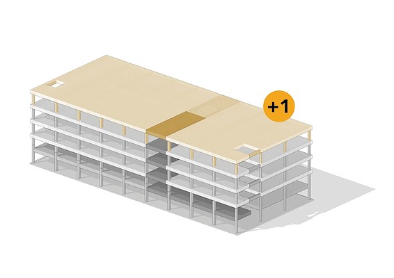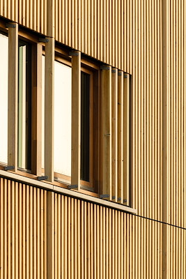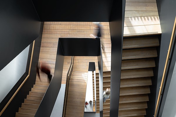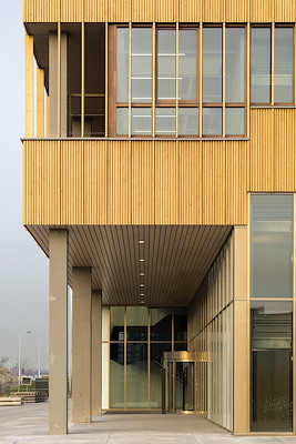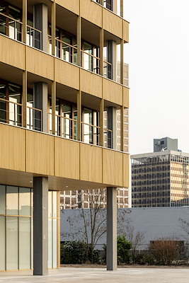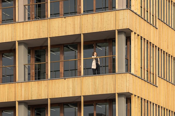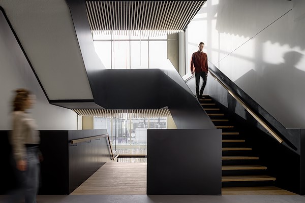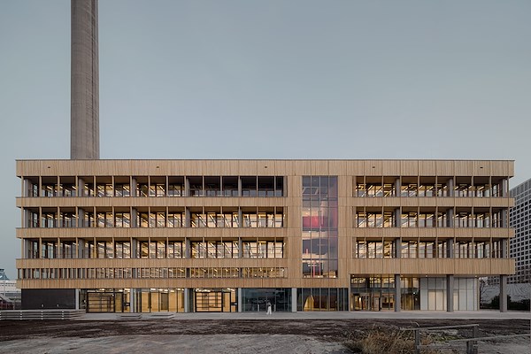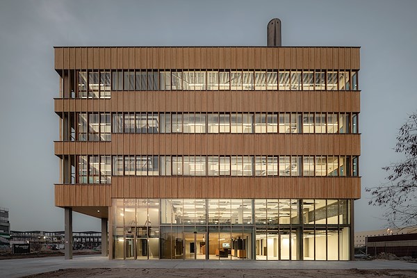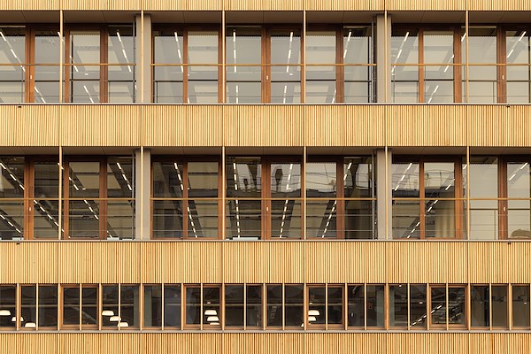 Daarbij is net uit 1969 stammende pand tot op het casco gestript en opnieuw opgebouwd. Door de bestaande structuur te behouden, is ongeveer 75 procent minder CO2 uitgestoten in vergelijking met volledige nieuwbouw, stelt GROUP A. Meest zichtbare ingreep is de nieuwe gevel, die bestaat uit houten lamellen en glas.