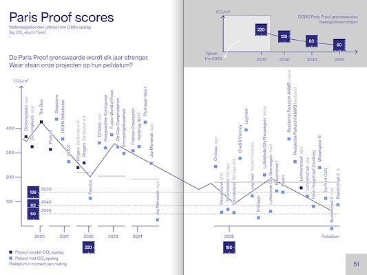 -uitstootreductie is ingezet. Twee derde van de projecten voldoet op het moment van meten voor deze rapportage aan de Paris Proof norm voor materiaalgebonden emissies. Omgekeerd valt daaruit op te maken dat de duurzaamheidsontwikkeling een stijgende lijn moet hebben.