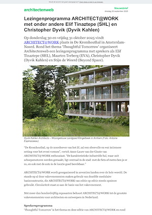 Lezingenprogramma ARCHITECT@WORK met onder andere Elif Tinaztepe (SHL) en Christopher Dyvik (Dyvik Kahlen)