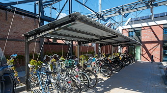 Veilig en droog fietsparkeren voor bewoners: FalcoAndo overkapping met FalcoSound rekken, passend bij het industriële karakter van Oranjepark.