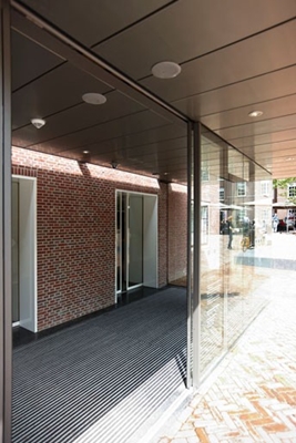 GEZE leverde voor dit zeer aansprekende project 7 entreeschuifdeuren. “De architect zocht naar een optimale openheid en transparantie. Hij wilde volglazen deuren en zo weinig mogelijk afleidende en beeldverstorende materialen in het zicht. Het was onze uitdaging om in een bestaande situatie, zo weinig mogelijk van de kozijnen zichtbaar te houden”, aldus GEZE-projectadviseur Richard Stevens.GEZE leverde voor de toegang tot de verschillende gebouwen 7 grote entree schuifdeuren, die werden geplaatst in een combinatie van tweemaal drie deuren plus een aparte entreedeur. Op die manier werden brede toegangen gecreëerd voor de bezoekers, maar tevens ook veilige vluchtwegen bij calamiteiten. De opdracht die GEZE, in nauwe samenwerking met de architect, uitvoerde, was het creëren van een volglazen entree, waarbij de kozijnelementen uit het zicht werden gehouden en volledig zijn weggewerkt achter de borstwering. Door een fraaie aftimmering van de dagkanten blijven alle deurkozijnen uit het zicht. Die glazen entreepartij sluit aan bij de volledig glazen binnenplaats, die is voorzien van een zwevend dak dat eveneens in glas is uitgevoerd. Hierdoor ontstaat een complete glazenruimte, die juist het monumentale karakter van het bestaande gebouw duidelijk in het zicht laat. De 7 cm die GEZE nodig had om de deuraandrijvingen te plaatsen, werden gevonden in de balklaag boven de deur. Daardoor ontstaat een optimale deurhoogte van 2,69 meter bij een breedte van twee meter. Richard Stevens: over het eindresultaat: “In een bestaande omgeving als deze, met de wensen van de architect in de hand, dat er geen beeldverstorende elementen als kozijnen en ook geen bovenloop in het zicht mag komen, is het geen sinecure daar de passende ruimte voor te vinden. We hebben dan ook behoorlijk moeten puzzelen om tot een juiste oplossing te komen. Maar het is tevens de kwaliteit van GEZE om te gaan voor de juiste oplossing, ook wanneer dit in eerste instantie onmogelijk lijkt.” Nu lopen de glazen deurpanelen door in het plafond. Stevens: “De uitdaging zat er in om alles in die krappe balklaag boven de deur weg te werken. Maar die ruimte was bijzonder krap. Maar de 7 cm, die toch al een minimale breedte is, hebben uiteindelijk daar gevonden. Daarmee laat het project duidelijk de mogelijkheden van GEZE zien, om daar waar anderen stoppen toch nog een tandje bij te zetten en te zorgen dat de architect en opdrachtgever dat krijgen wat ze wensen.”
