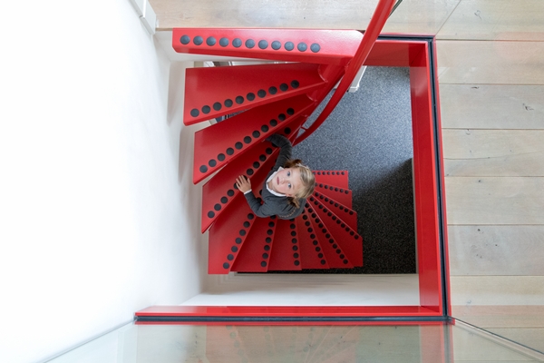 “In Nederland worden huizen steeds efficiënter ingedeeld. Daarom is het eigenlijk raar dat trappen in de Nederlandse huishoudens nog steeds zoveel ruimte innemen. Om ook moeilijk bereikbare ruimtes in het huis zo optimaal mogelijk te benutten, hebben wij een designtrap ontworpen die op beide verdiepingen slechts 1m2 nodig heeft. Hiermee is deze trap een ideaal alternatief voor bijvoorbeeld een vlizotrap.”
