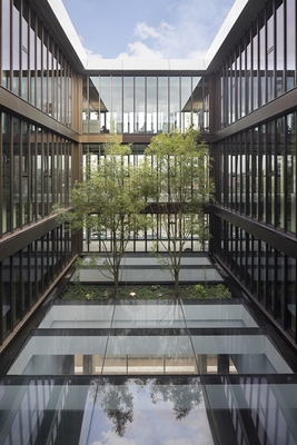 ’ in London is een voorbeeld waar het construeren met glas tot een hoogtepunt komt. In dit project bestaat de draagconstructie van het dak uit glazen liggers van 3 lagen glas met tussen de lagen translucente folies. Deze glazen vinnen hebben een lengte tot 11 meter. Naast de complexiteit van het construeren van de liggers was ook lag er ook een grote uitdaging in de vorm van het dak. Doordat het niet mogelijk was een plat dakvlak te realiseren tussen de bestaande geometrie van de omliggende dakranden is een dubbelgekromd dakvlak ontworpen. De isolatieglas panelen zijn van in een vlakke basis vorm op de constructie gelegd en geklemd in een getordeerde vorm.