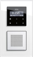 De intuïtieve bediening is zeer comfortabel dankzij een capacitief sensorvlak en een hoogwaardig display voor de weergave van informatie en zendergegevens. Met zijn volledig nieuw ontworpen luidspreker biedt de radio een zuiver, vol geluid – zelfs in uitstekende stereokwaliteit bij aansluiting van de optioneel verkrijgbare extra luidspreker van Gira. De luidsprekers kunnen direct naast het bedieningselement van de radio worden aangebracht of, verbonden met een 2-aderige leiding, op een afstand van maximaal 20 m. De radio detecteert zelf de aangesloten luidsprekers en schakelt automatisch om tussen stereo en mono.