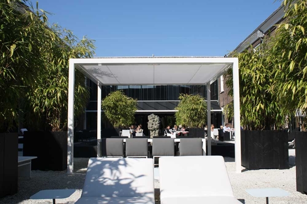 zelfs als perfecte terraszonweringoplossing op het dek van een restaurantboot. In ons eigen land zijn er o.a. sprekende voorbeelden van vrijstaande plaatsing op een dakterras maar ook gekoppelde gevelmontage bij een restaurant.