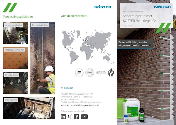 van Köster bestaat uit 6 Polyurethaan injectieharsen die voor alle voorkomende gevallen een zekere oplossing bieden. Bij de ontwikkeling van deze injectieharsen is veel aandacht besteed aan de eenvoudige verwerking en de duurzame werking van het product. Met ons programma kunnen naast scheurinjectie ook grindnesten, wand/vloer aansluitingen en lekkende damwanden worden afgedicht. Zowel lekkende scheuren als droge te stabiliiseren scheuren kunnen worden hersteld en afgedicht. Systemen voor duurzaam betonherstel en betonrenovatie.
