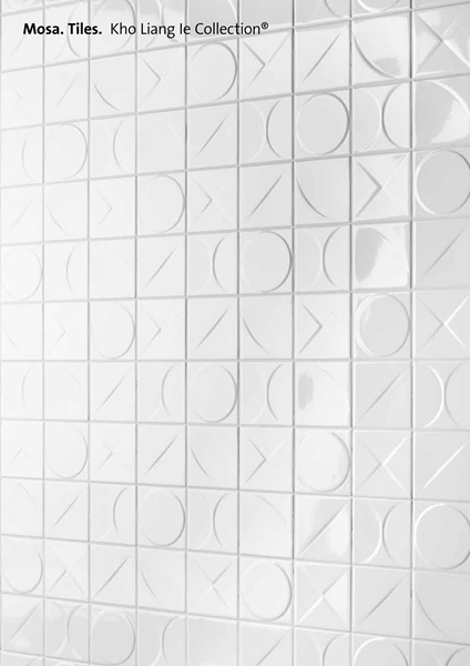 Mosa heeft een designklassieker uit de jaren zestig opnieuw in productie genomen: de ‘Classics Kho Liang Ie Collection®’. Glanzend witte tegels, met in reliëf cirkels, cirkelsegmenten, diagonalen en driehoeken. Afmeting 10 x 10 cm. In combinatie leveren de verschillende reliëftegels een verrassend beeld op. Naast de reliëftegels is er ook een bijpassende vlakke wandtegel.