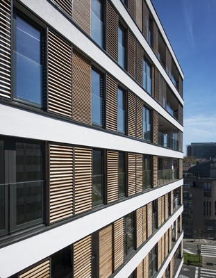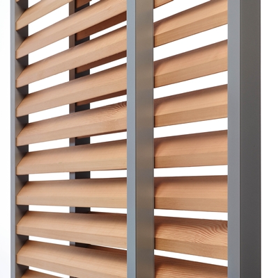 DucoSlide Wood – verkrijgbaar met een lamelhoogte van 53 en 65 mm – geeft elke gevel een speciale en esthetische touch dankzij de perfecte symbiose van hout en aluminium. De houten lamellen worden onzichtbaar binnen het aluminium kader bevestigd en zijn bovendien kwartiersgezaagd. Dat zorgt niet enkel voor stevigere lamellen, maar gaat ook vervorming tegen. Dit in combinatie met de duurzame en veerkrachtige houtsoort Western Red Cedar (die eveneens uitstekend bestand is tegen rot en verwering), het lichte gewicht en de beperkte paneeldikte maakt van DucoSlide Wood het architecturale zonweringsysteem bij uitstek.