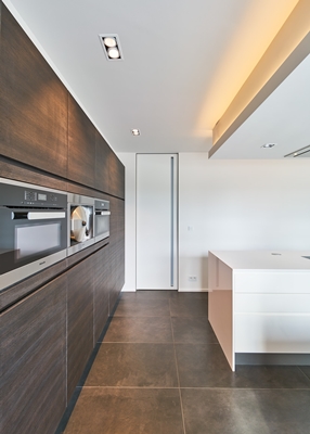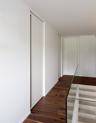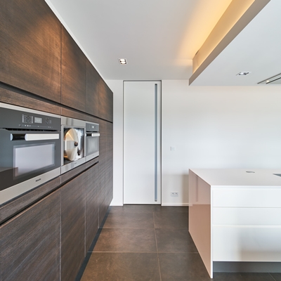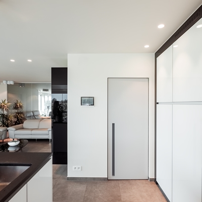 noemen. De belangrijkste parameter voor een zorgeloze afwerking is de centrale montage van het aluminium inbouwkozijn. Dit garandeert een stabiele montage en voorkomt dus scheuren en barsten! Daarnaast zorgt deze eigenzinnige montage ervoor dat de deuren er in beide vertrekken identiek uitzien en creëert dus optische symmetrie!