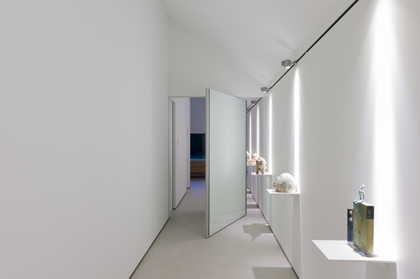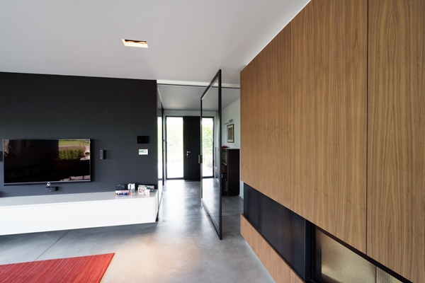 De onzichtbare scharnieren zitten volledig in het deurblad geïntegreerd waardoor op de vloer buiten het compacte 'voetje' niets zichtbaar is.
