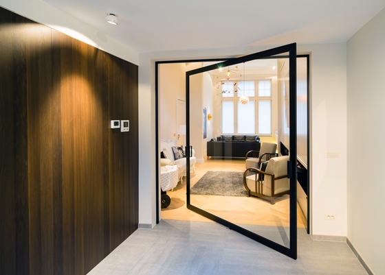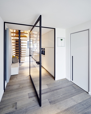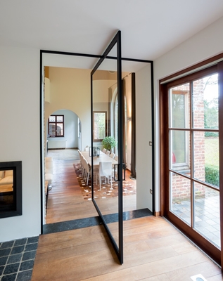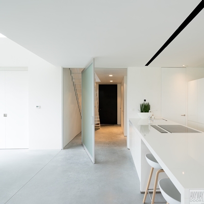 Een glazen taatsdeur tot maximaal 5.5m² is hierdoor vederlicht te bedienen. De 'Anyway' filosofie laat de deur in alle mogelijke richtingen opendraaien. De scharnieren kunnen naar wens excentrisch of centraal op de vloer opgebouwd worden.