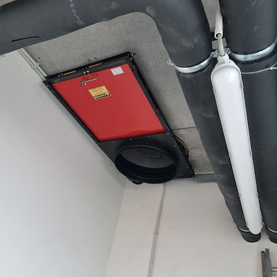 , daarnaast wordt er een bij brand sterk opschuimende band aangebracht. Door de drie-dimensionele uitzetting wordt er voor gezorgd dat eventuele kleine kieren worden gesloten en zo de trek door de stortkoker wordt voorkomen.