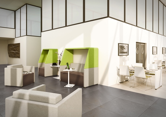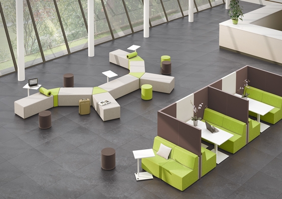 Gestoffeerde banken kunnen worden samengevoegd tot loungeeilanden of zithoeken, tot eindeloze banken of wachtruimtebanken. Ze bieden een grote mate van vormgevingsvrijheid. Contrastrijke