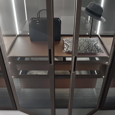 Het Cover systeem maakt het mogelijk om inloopkasten en niches volledig te realiseren en integreren in verschillende interieurs, zonder het gebruik van een grondrail. Cover is beschikbaar met de aluminium structuur in melkwit bruin en de geanodiseerd aluminium afwerking. De greep (met of zonder slot) is in de deur ingebouwd en verkrijgbaar in dezelfde afwerking als de constructie.