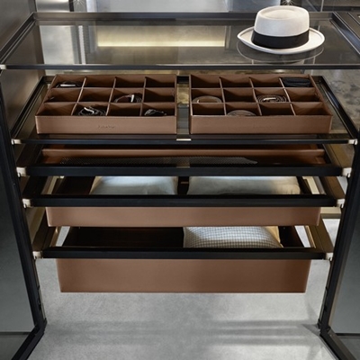 Het systeem biedt een scala aan accessoires van 400 mm diep, gewijd aan de woonkamer en werkruimten. Het omvat planken, hoekplanken en zwevende ladenblokken met push opening. Ladenblokken zijn verkrijgbaar in de breedte 1100 mm, met de top afgewerkt in gelaagd glas. .