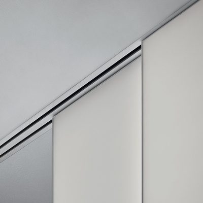 Detail panelen in bianco latte mat glas, inbouwrail in kleur van plafond