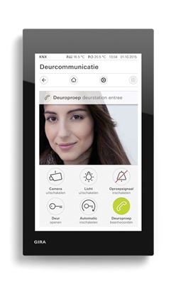 In combinatie met de Gira TKS-IP-gateway en een deurstation video werkt de Gira G1 bovendien als volwaardig huisstation. Als wordt aangebeld, schakelt het apparaat automatisch over naar de deurcommunicatiemodus. Met een vinger wordt de communicatie gestart, de deur geopend en zo nodig het licht ingeschakeld.