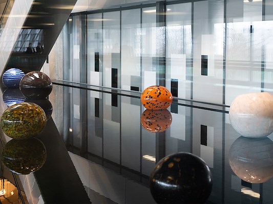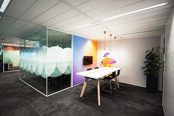Wij spelen graag met contrasten in transparantie, kleur én licht. Met als eindresultaat vaak een speelse mix tussen privacy en een open ruimtelijk gevoel. Glasdecoratie heeft verrassend genoeg nog méér in huis: gebruik het ook als functionele bewegwijzering, branding of als kunstobject. Maar denk ook aan de mogelijkheid om de glasdecoratie te laten aansluiten in de decoraties op wand, vloer of plafond, zo creëren we één uniforme sfeer in het interieur die past bij de identiteit van het bedrijf of instelling.