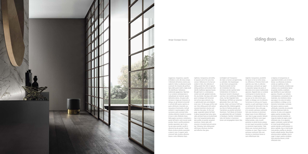 Oneindig zijn de oplossingen in glascombinaties met de Rimadesio glasafwerking en aluminium constructie-elementen. De Soho schuifdeur is ook verkrijgbaar in gefineerd noten of warmtebehandeld eiken.