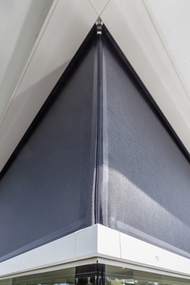Grote glaspartijen met hoekramen zijn een ware trend. Met Panovista Max kan men onafgebroken zonwering plaatsen bij glaspartijen tot zes meter breed (met een totaaloppervlak van maximum 30m²), zonder dat hinderlijke profielen of kabels in de hoek zichtbaar zijn. Ook nieuw is de ritssluiting die beide doeken op de hoek aan elkaar koppelt bij het neerlaten en zo voor een esthetische oplossing zorgt. Bovendien is de zonwering hierdoor nog stabieler en valt ze in de hoogste windklasse. De meegeleverde glasvezeldoeken zijn in talrijke kleuren verkrijgbaar en kunnen naar believen worden gecombineerd met alle zonwerende doeken van Renson. De beide zijden van het systeem rollen tegelijk op en af in de smalle kast van 150 bij 155 mm en verdwijnen bijna onzichtbaar in de architectuur van het gebouw.