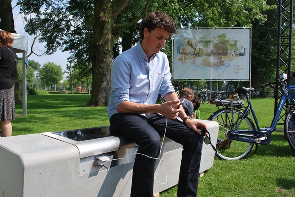 past heel mooi in dat concept. Een outdoor design bank, uitgerust met 230 Volt of USB stopcontacten die werken op zonne-energie. Met de opgewekte elektriciteit kan je bijvoorbeeld je telefoon, tablet of laptop opladen. Omdat in de buurt van een school of kantoor vaak ook al wifi is, belemmert niks je meer om buiten te werken. En het gebruik ervan is dus gratis.
