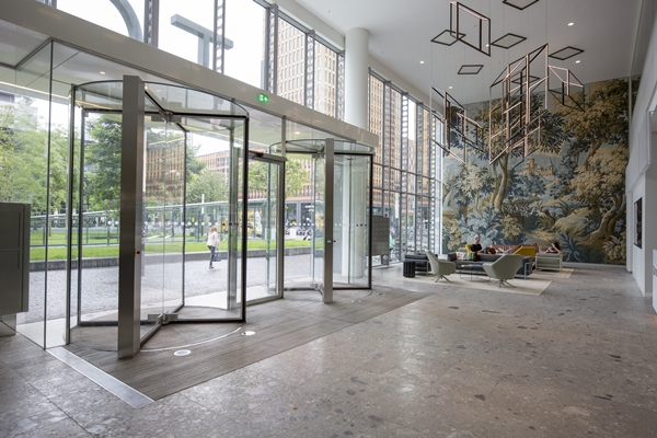 Tourniquetdeur met hoogglans mirror finish RVS als hoofdentree van het kantoorgebouw NoMA House