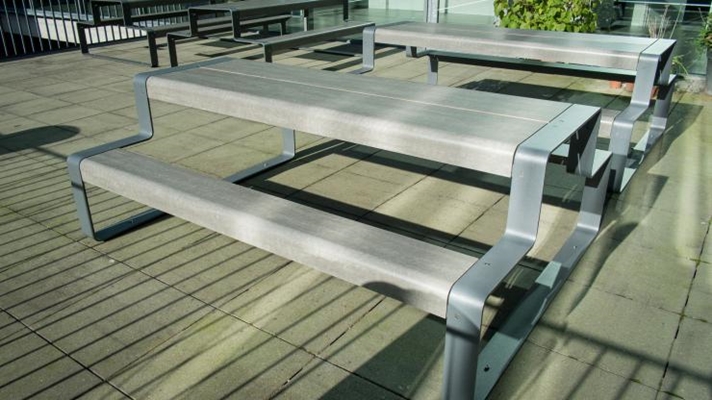 Oersterke picknicktafel met een industriele uitstraling voor de (semi-) openbare ruimte