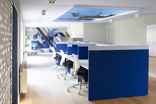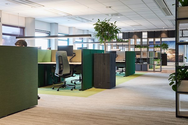 De wanden met dikke akoestische vulling absorberen het geluid direct. Zo verbetert de akoestiek in de ruimte en worden meerdere werkplekken eenvoudig omgebouwd tot een callcenter of een focus werkplek.