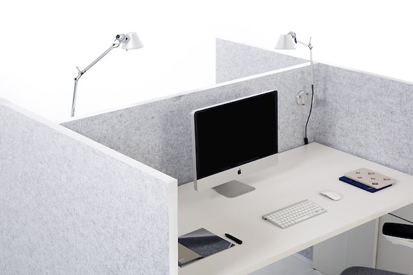 De akoestische wanden zijn vrijstaand op T-poten of stelvoeten en kunnen ook aan het bureau gemonteerd worden met een bureauklem.