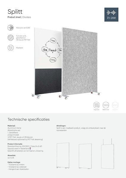 De akoestische ruimtedeler Splitt is een flexibele en efficiënt inzetbare scheidingswand. De ruimtedeler kan vrij in de ruimte worden geplaatst. Bijvoorbeeld tussen de werkplekken van een callcenter. Ook om een ruimte eenvoudig visueel en akoestisch af te schermen zijn de schermen erg geschikt. De ruimtedeler is vrijstaand, verrijdbaar of hangend uit te voeren.