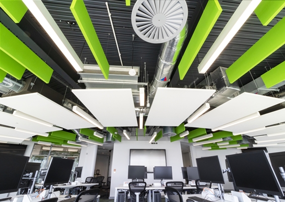 De altijd actuele en trendy Ecophon Solo biedt vrijheid van ontwerp en de mogelijkheid om opvallende nieuwe omgevingen te creëren. De vrijhangende panelen zijn allemaal 40 mm dik en verkrijgbaar in alle vormen, kleuren en maten die je nodig hebt om je artistieke ideeën in praktijk te brengen.