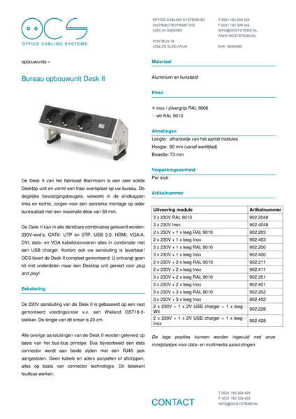 De DESK 2 verzorgt stijlvol oplaadpunten op een tafelblad. Kies uit een 3-, 4-, 5- of 6-voudige versie met standaard 230V en andere aansluitingen zoals data, HDMI, VGA/audio, USB 3.0 en audio. De DESK 2 wordt met aluminium montagebeugels aan een blad bevestigd en kan dus gemakkelijk van plaats veranderen.